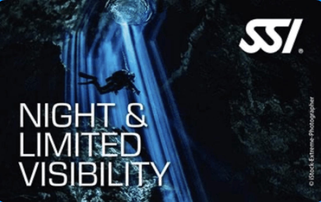 Al finalizar, obtendrás la certificación de especialidad de Night Diving and Limited Visibility de SSI y estarás preparado para bucear de noche o con visibilidad limitada.